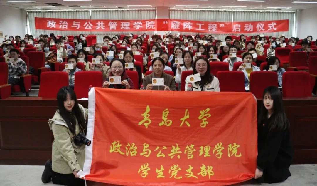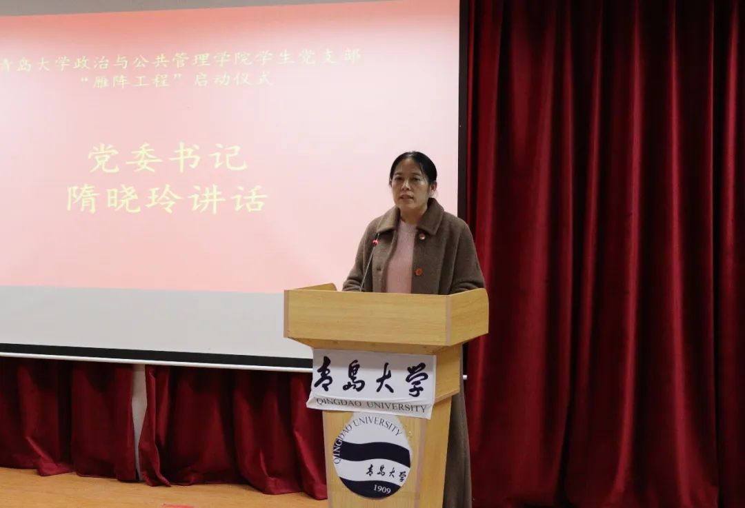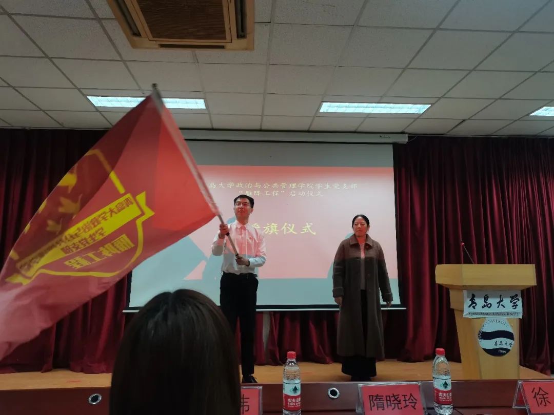 随后,由隋晓玲向学生党支部代表授予“雁阵工程”项目旗。学生党支部代表孙汉青庄重地接过旗帜,尽情挥舞,传递着激情与梦想,执着与坚定,群雁高飞,头雁领,旗帜飘扬,意高昂,现场的阵阵掌声将仪式气氛推向高潮。
