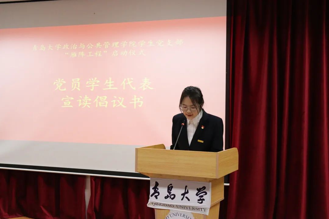 之后,学生党员代表张荣玺宣读“雁阵工程”倡议书。向全体“雁阵工程”成员发出倡议,呼吁全体学员们以饱满的热情、昂扬的精神面貌,积极主动地投入到“雁阵工程”计划的实施中去,努力做到“讲规矩,听号召”、“讲品德,秉初心”、“讲学习,夯理论”、“讲行动,懂奉献”,生其时,担重任,为学院的建设贡献你我的力量。