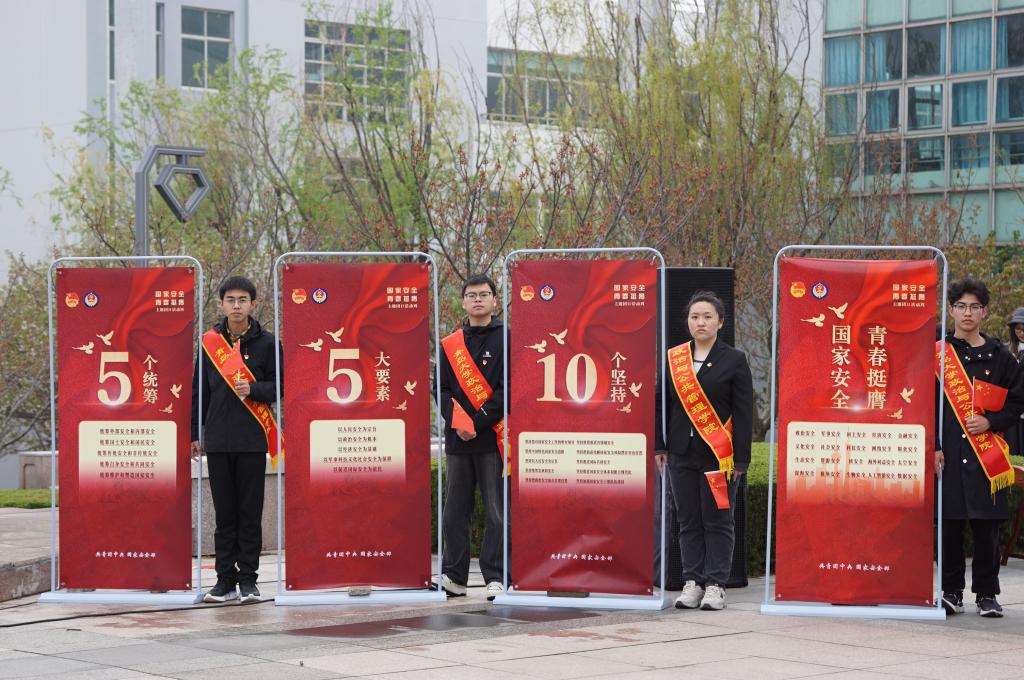 在图文中心前广场,“雁序成行”党员志愿队成员手拿国旗、胸戴党徽,向途径的同学介绍总体国家安全观的“五大要素”“五个统筹”“十个坚持”和“十六种安全”,脉络清晰地普及国家安全大事记,引导同学们树立正确的国家安全观念,提高国家安全意识。