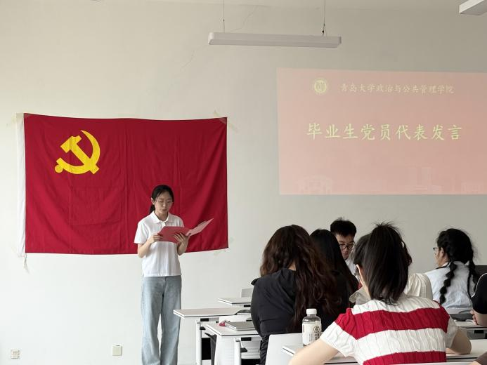 毕业生党员代表董怡秀上台发言,她分享了个人在大学期间的收获与成长,表达了对党组织培养的感恩之情,也代表全体毕业生党员做出了牢记党员使命、传承政管精神,在实现中华民族伟大复兴的征程中贡献青春力量的坚定承诺。