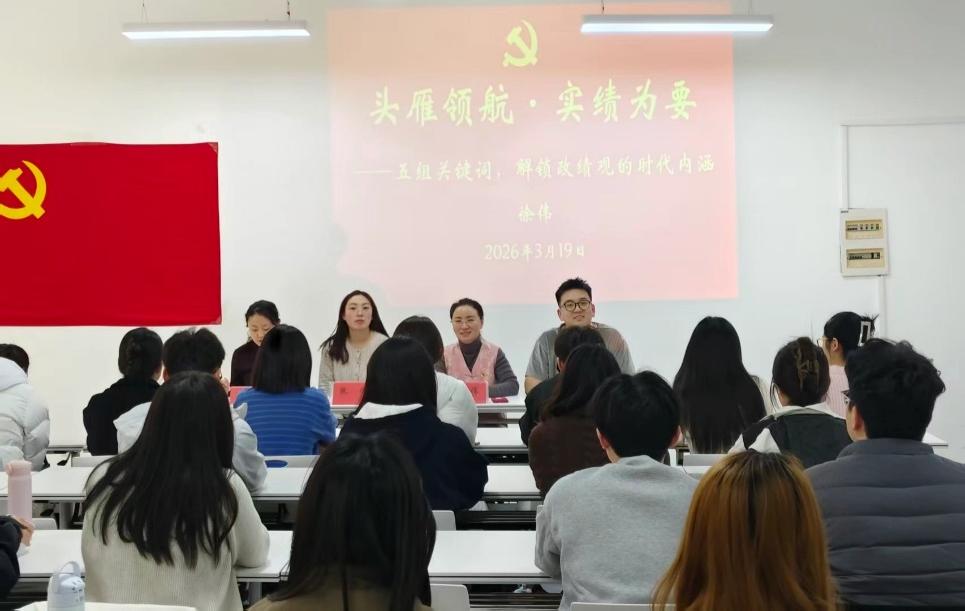 学生党支部于3月19日在二号实验楼405室举行“头雁领航·实绩为要——五组关键词,解锁政绩观的时代内涵”专题党课。学院党委副书记徐伟主讲,学生党支部书记张伟、辅导员老师王嘉伟、商玉坤及学院全体学生党员参加。