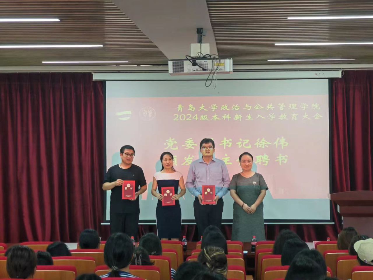 接下来,张伟宣读了《关于聘任2024级本科新生班主任的决定》,徐伟为各班班主任颁发聘书。