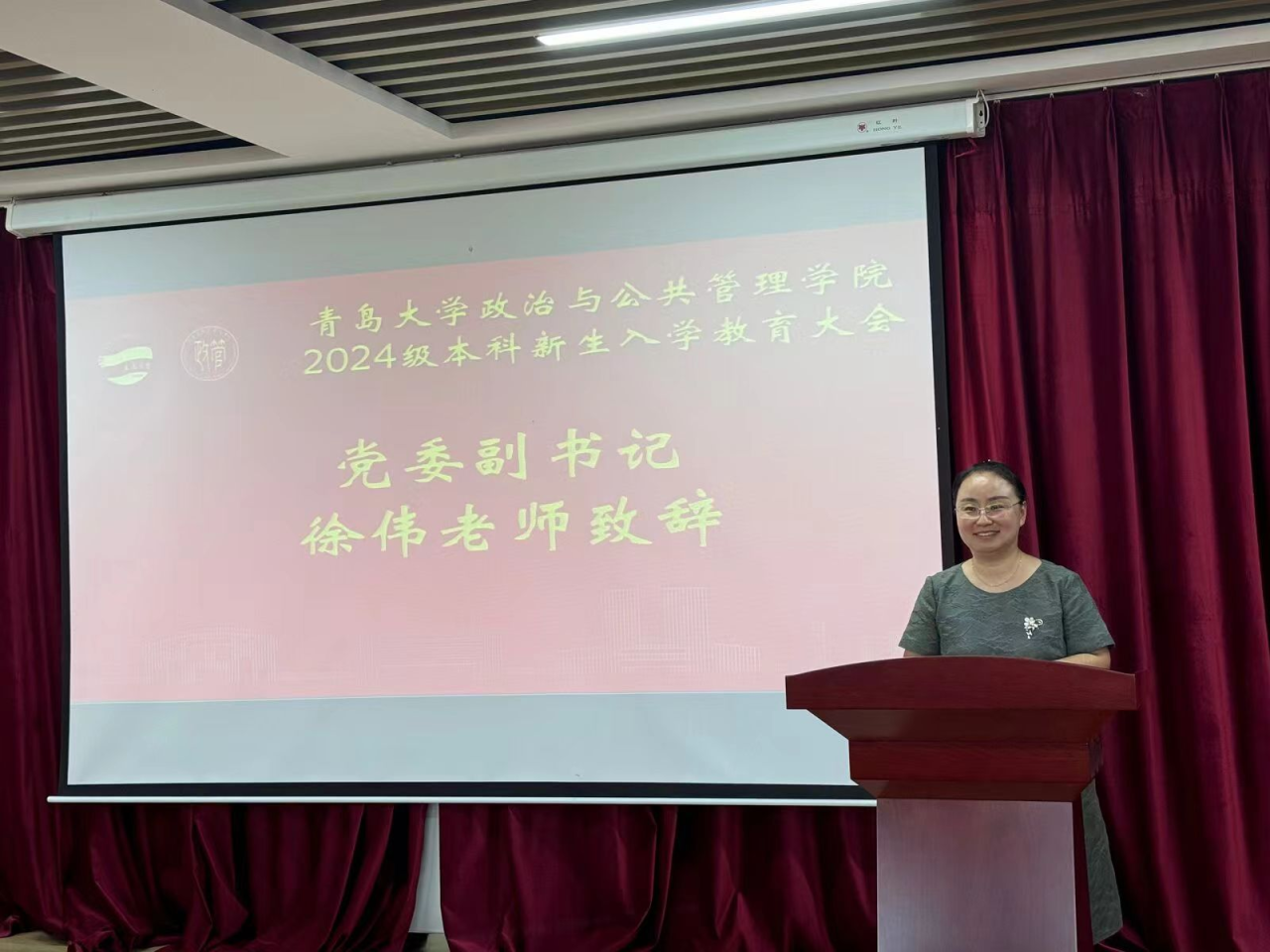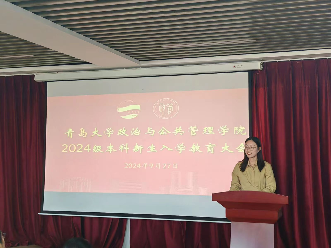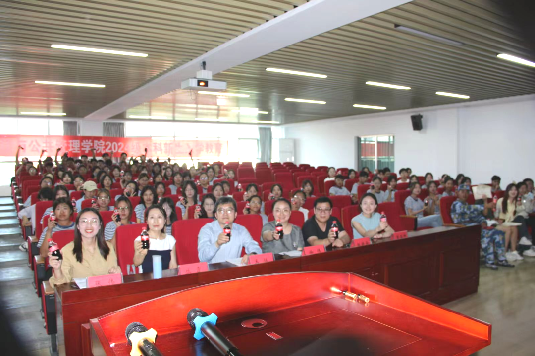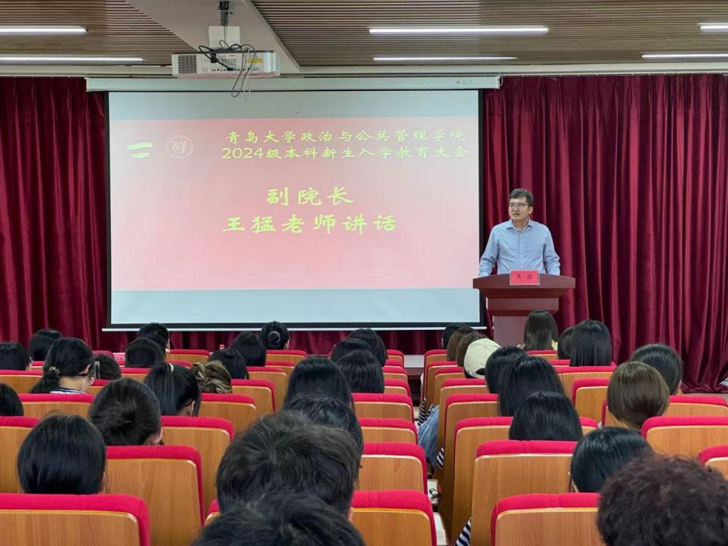 于9月27日下午在金家岭校区图文中心三楼报告厅召开2024级本科新生入学教育大会。学院党委副书记徐伟、副院长王猛、行政管理专业老师赵延金、国际政治专业老师丛霞、辅导员老师商玉坤以及2024级全体本科新生参加本次会议,会议由2024级新生辅导员老师张伟主持。