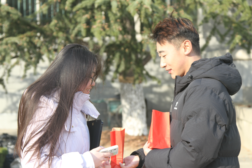 学弟学妹也在图文中心门口为即将毕业的学长学姐送去了暖心的祝福。他们特意准备了充满美好寓意的“入冬温暖包”。礼包里的每一份礼物都有着自己独特的意义:旺仔牛奶糖寓意好运常临,黑咖啡象征精力充沛,暖宝宝代表温暖常伴,他们衷心祝愿各位学长学姐能够披荆斩棘,在考试中取得优异成绩。