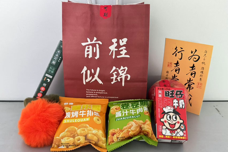 福袋里承载着老师亲自手绘的加油漆扇,精心挑选的零食、明信片、文具盲盒以及象征着事事如意的柿子挂件。礼包中满含着学院老师对同学们深深的期望与祝福,希望毕业学子们能够心想“柿”成,“苹”稳上岸。