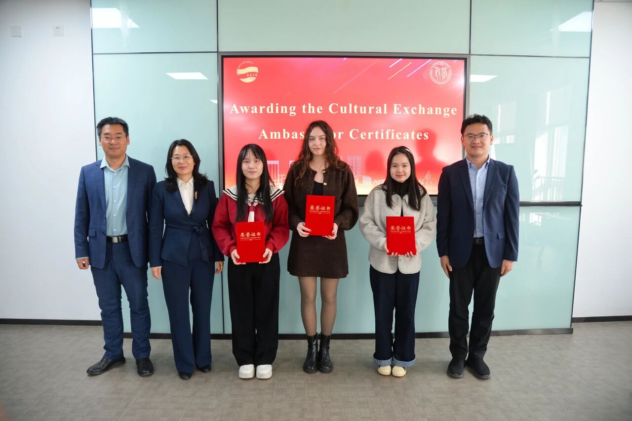 在颁奖环节,周允旭、张宁、梁彩霞为学院2025级国际关系专业研究生Elizaveta Butorina(俄罗斯)、Ngo Nguyen Ngoc Huyen(越南)和Dinh Thi Thom(越南)颁发“文明交流大使证书”,表彰三位留学生在积极融入校园文化、促进中外文化交流与融合方面做出的努力。