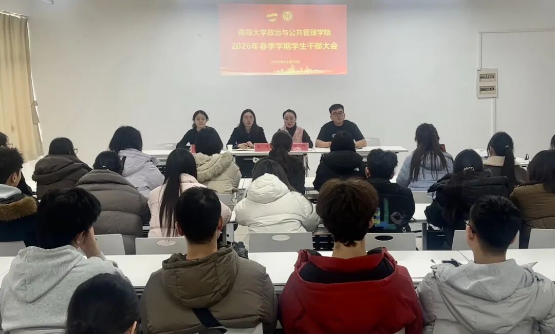 于二号实验楼405教室召开2026年春季学期学生干部大会。学院党委副书记徐伟出席会议,辅导员老师张伟、王嘉伟、商玉坤以及全体学生干部参加本次大会。