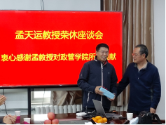在金家岭校区2号实验楼多功能活动室举办孟天运教授荣休座谈会。学院党政领导班子成员、社会学系全体教师、各教学系(科室)和毕业生代表参加座谈会,学院党委书记程济华主持座谈会。