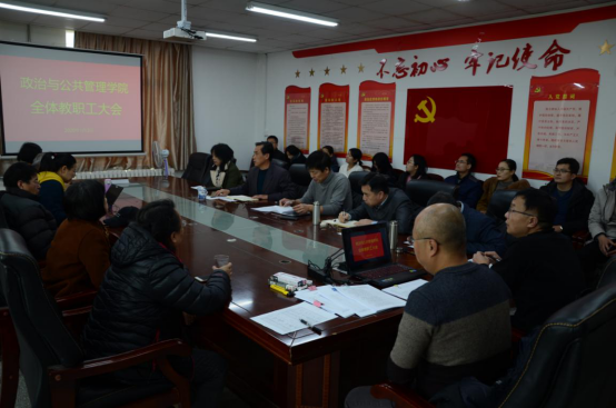 在金家岭校区2号实验楼214多功能活动室召开全体教职工大会,对2019年学院党建工作、党风廉政建设责任制落实情况和中层干部进行民主测评,党委书记程济华主持会议。