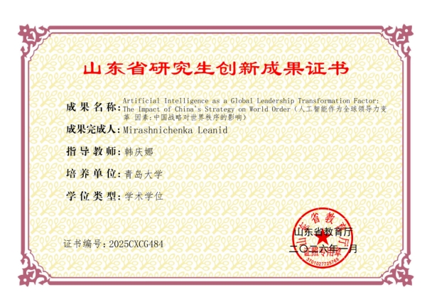 来自白俄罗斯的国际关系专业硕士留学生Leanid Mirashnichenka(李安迪)的研究成果《Artificial Intelligence as a Global Leadership Transformation Factor: The Impact of China’s Strategy on World Order(人工智能作为全球领导力变革因素:中国战略对世界秩序的影响)》成功入选山东省研究生创新成果,副院长韩庆娜教授担任指导教师,研究成果体现了吃瓜